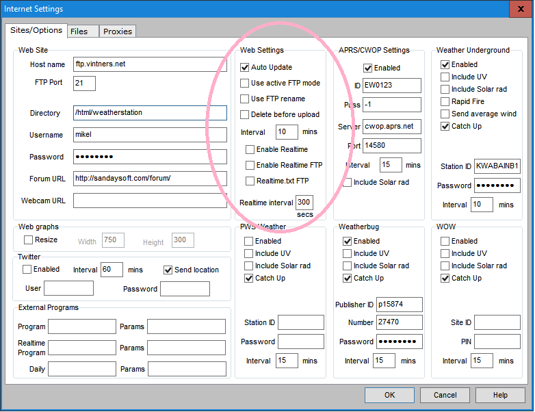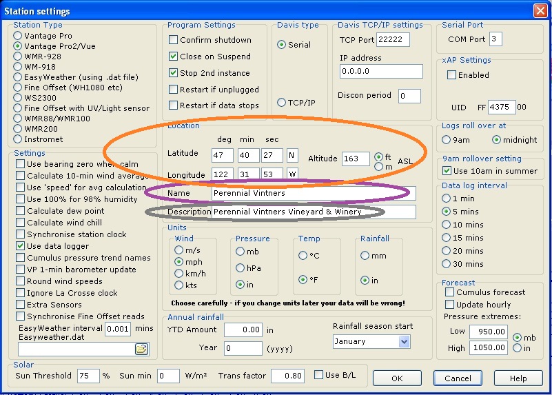Cumulus->Configuration->Station screen, "Description". screen shot Top of almanac table, in normal text, says "Conditions at local time"; time is way off. In sample screen, the light-blue highlighted area. This is the "#time" tag string from Cumulus and is filled in automatically when this web file is uploaded to the server. If this time is close to the current time, all is working -- the server uploads this file every few minutes (The default is 10 mins). If you wish to change the upload frequency, this is the "Web Settings" "Interval" field in the Cumulus->Configuration->Station screen, config screen shot (see pink highlight). You can force an immediate update by Cumulus->File->Web Update screen shot. If that's not it, this time value is derived from the system clock of the PC running Cumulus. Check that the time is set correctly on that machine. Directions in the New Client Install page.