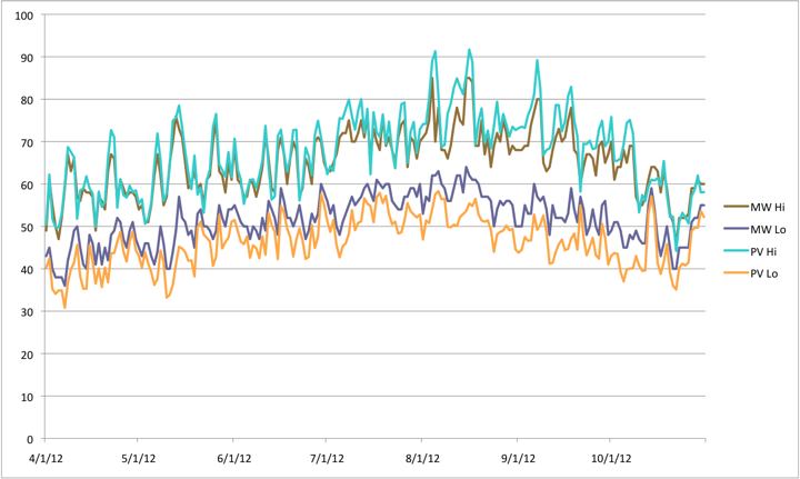 For the 2012 GDD season, the MesoWest highs are only slightly below Perennial Vintners, but the Perennial Vintners lows are lower than MesoWest. This may be due to the marine influence 'leavening' the MesoWest temperature, whereas the open exposure away from the water at Perennial Vintners has somewhat higher highs and notably lower lows.