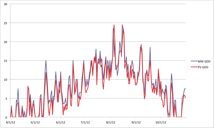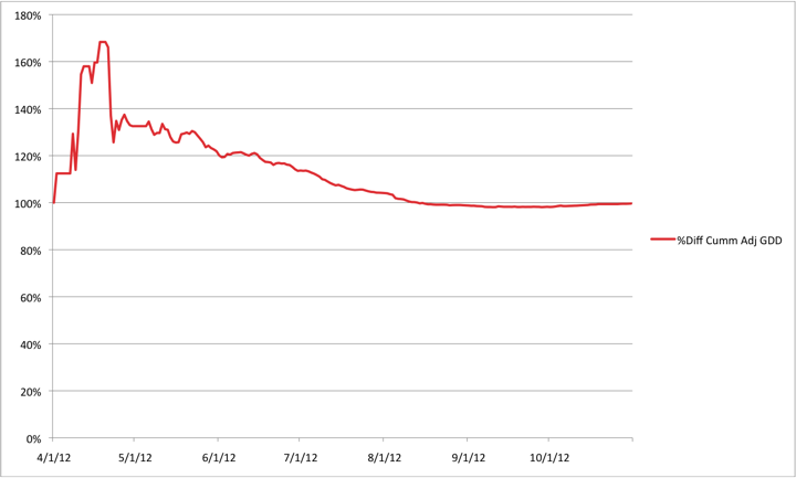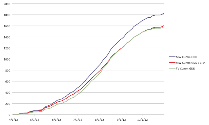 The cumulative GDD for Perennial Vintners as of October 31, 2012 was 1580, whereas the cumulative GDD at MesoWest was 1827. Therefore, MesoWest had 116% of the Perennial Vintners GDD, or conversely, Perennial Vintners had 86% of the GDD of MesoWest.